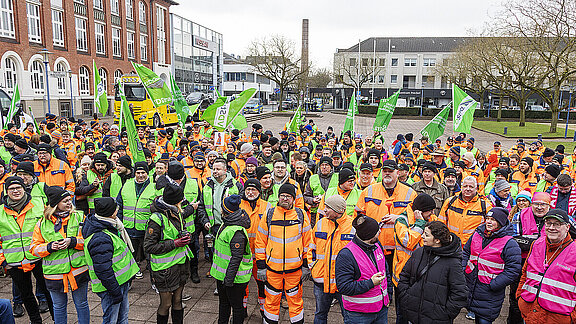 Mit einer Menschenkette aus 600 Leuten haben die Beschäftigten des öffentlichen Dienstes in Kiel für höhere Einkommen und bessere Arbeitsbedingungen demonstriert.